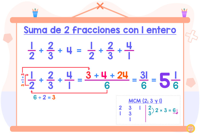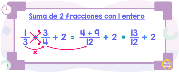 Hoy veremos cómo sumar 2 fracciones con 1 número entero. Ya verás que es muy fácil y similar a la suma de fracciones que hemos visto antes. Existen varios métodos para realizar esta suma, por eso aquí te mostraré 2 métodos distintos para que uses tu favorito.